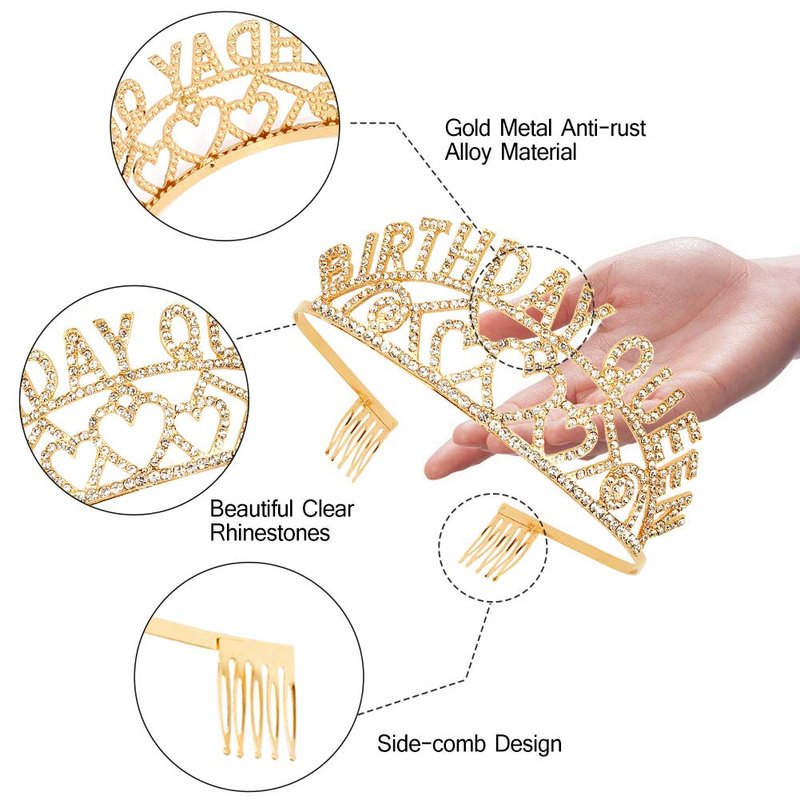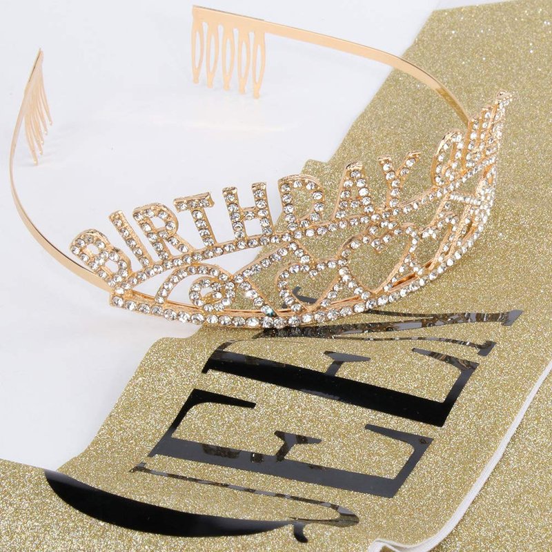- High Quality: Birthday Crown made of alloy with glitter crystals, it looks shinny, will make you more beautiful and eye-catching. Birthday Sash made from gold glitter fabric, apply to any outfit and durable enough.