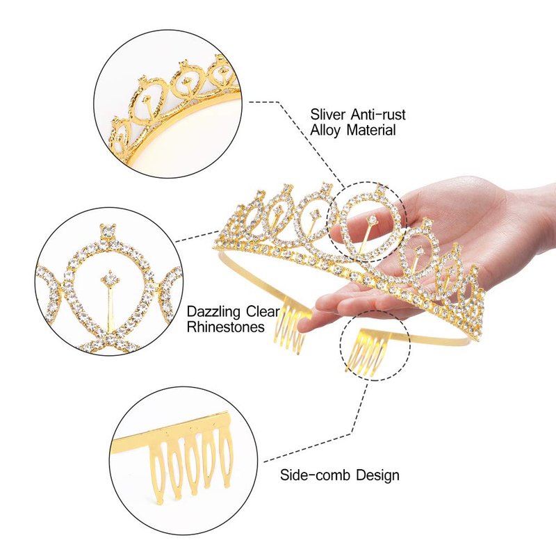 - Rhinestone Tiara: Made of high quality clear crystals in Gold-plated metal setting, eco-friendly,Alloy is with diamond look and hard texture for practicality and aesthetics.