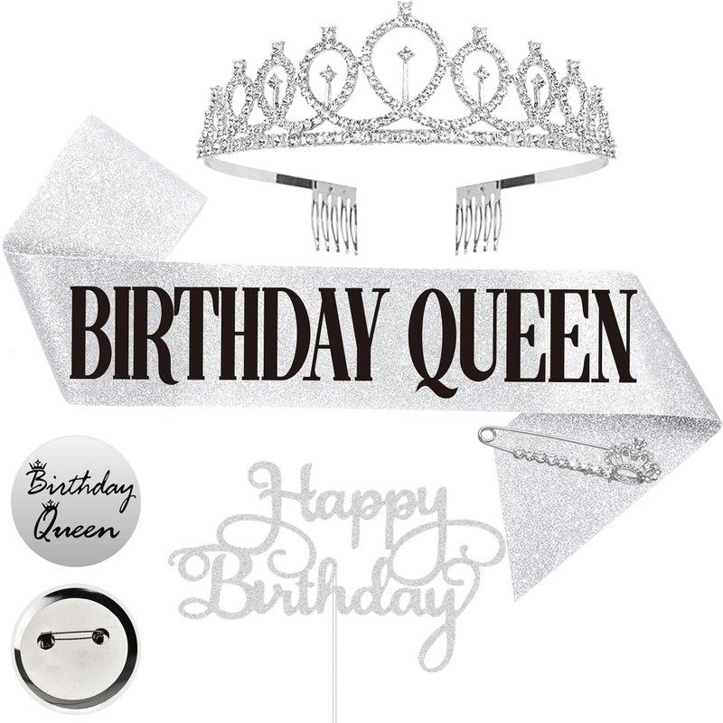 Birthday Decorations for Women Including Birthday Sash & Pin, Crown, Birthday Cake Topper, Birthday Pin Button. Queen Sash and Birthday Tiara for women and Grils MS4U (Silver)