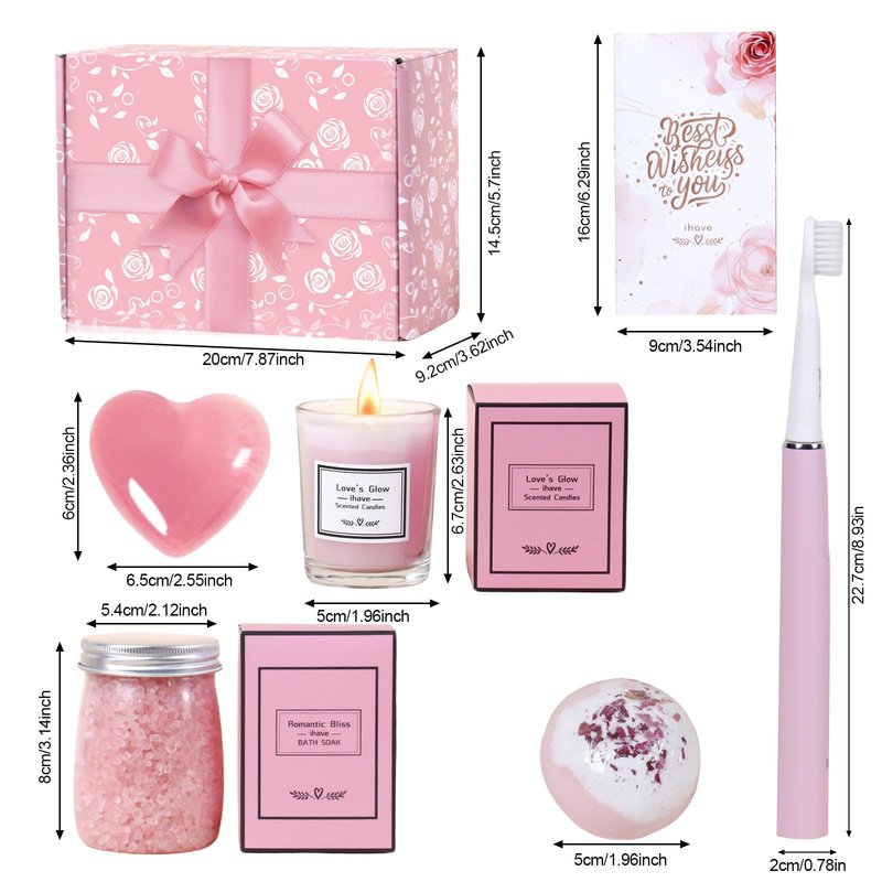 iHave presents the quintessential Birthday and Valentine's Gift for Women - the Rose Spa Gift Basket. Thoughtfully curated to offer relaxation and tranquility, this collection is the perfect representation of care and love, just the right choice for birthdays, Christmas, Mother's Day, Valentine's Day, and anniversaries. Each item in this gift set is inspired by the timeless beauty of roses, conveying deep thoughtfulness and making the receiver's experience unforgettable. For the ladies who mean the world to you, here's our 6-piece Sister Gift Basket - the best Valentine's gift. It includes an electric toothbrush, a scented candle, bath salt, a bath bomb, soap, and a heartfelt greeting card. Elegantly designed with a beautiful rose theme, this gift set is aimed to provide relaxation, tranquility, and happiness. It's a truly heartfelt way to show her just how much she means to you and let her indulge her senses in this luxurious experience. Show your loved ones how much they matter with our Spa Gift Basket Set. This elegant rose-themed package is designed to impress, making it an extraordinary birthday present for women who seemingly have everything. The sweet sentiment "Enjoy sweet moments" on the wine tumbler adds a personal touch, making this gift suitable for best friends, sisters, moms, daughters, coworkers, or girlfriends. The iHave Rose Gift Basket is not just perfect for birthdays; it also makes a delightful present for Christmas, Mother's Day, Valentine's Day, and anniversaries. With a charming pink greeting card included in the set, you have the opportunity to personalize your message, expressing your love and gratitude to the special women in your life. Our Rose Gift Basket for Women stands as a symbol of love and appreciation, providing you with the opportunity to create unforgettable moments. Each item is carefully chosen and beautifully designed, showing your loved ones just how special they are. Give them the luxury to feel cherished and appreciated with this artfully curated gift set.