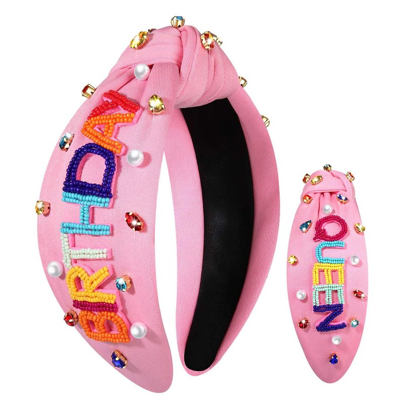 Birthday Headband for Women Beaded It’s My Birthday Knotted Headband Embellished Rhinestone Crystal Top Knot Headband Birthday Crown Hair Accessories Party Decorations Gifts (Birthday Queen 3)