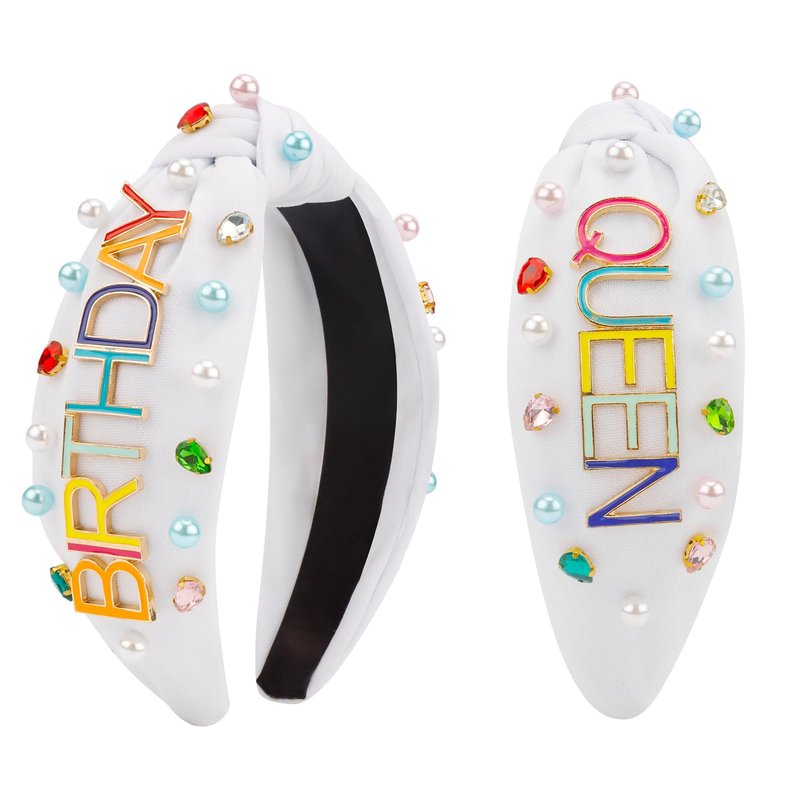 Birthday Headband for Women Birthday Queen Crown Birthday Tiara Knot Headband for Girls White Pearl Hair Band Beaded Headbands Candy Accessories Wide Rhinestone Headband Party Decorations Gifts