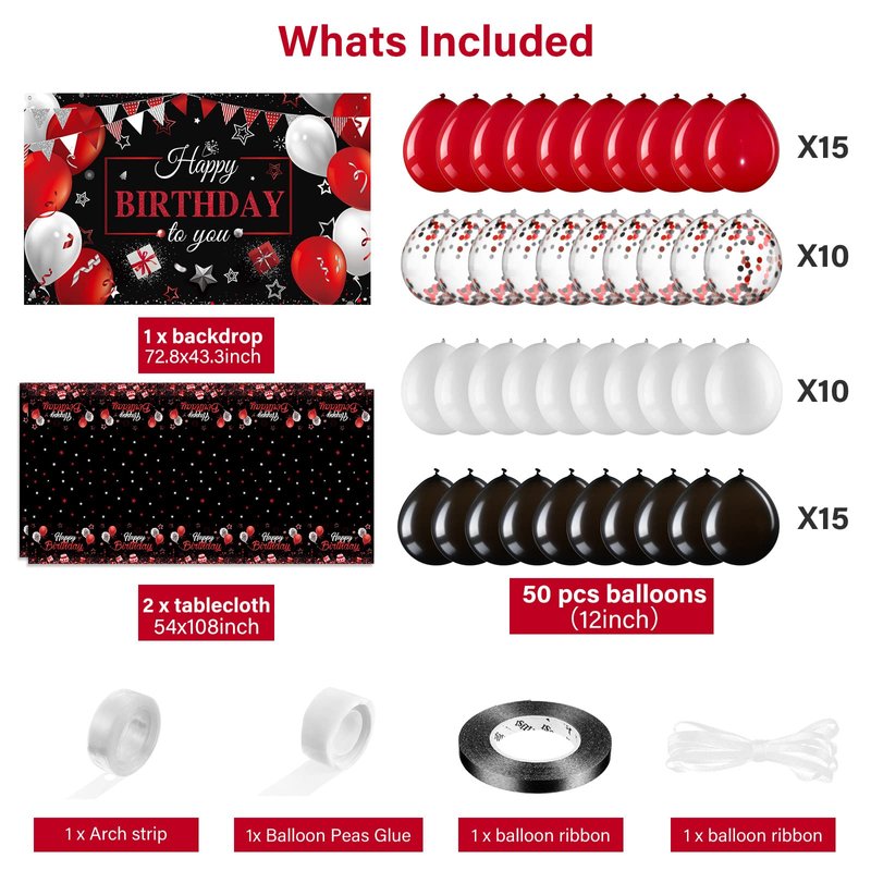 - Package Includes: you will get 1 pieces of red black happy birthday background banner, 50 confetti balloons, 2 red black tablecloths, 1 roll of balloon glue, 1 roll of balloon chain, 1 roll of ribbon; They will be the ideal addition to your birthday party, decorating with these colorful balloons and banners will give you a strong birthday atmosphere