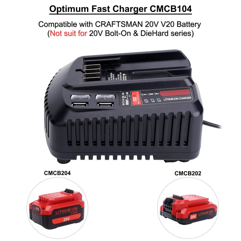- Work as OEM Technology: Charger replacement for CRAFTSMAN 20V max V20 lithium-ion battery charger CMCB104, CMCB124, CMCB100, CMCB102, CMCB101. Compatible with CRAFTSMAN V20 Lithium Battery CMCB204, CMCB202, CMCB201, CMCB205, CMCB209. (NOT for Bolt-On & DieHard series)