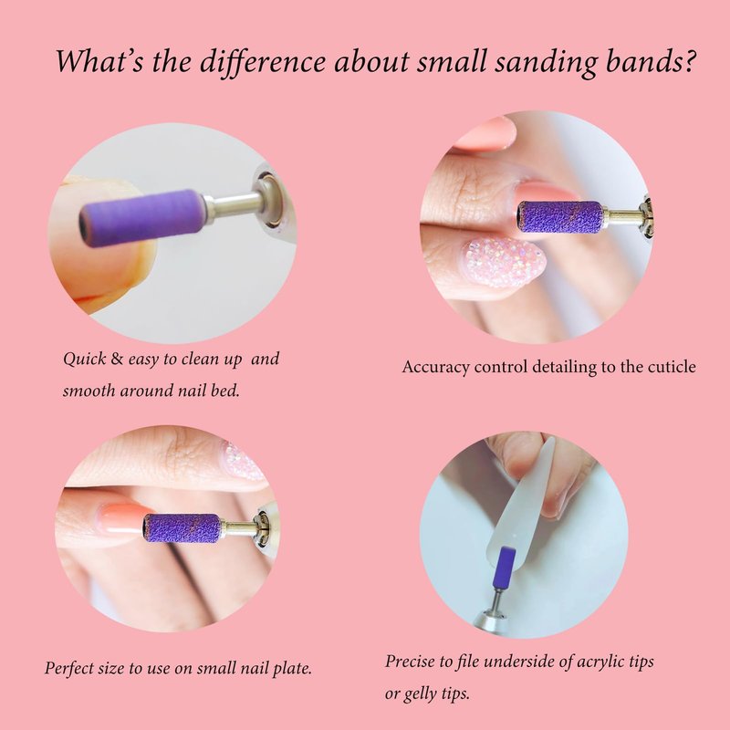 - Multifunctional Using: BITNBITH small nail sanding bands sets is upgraded thicker sandpaper for removing shine from natural nail and prepping smaller nail plates. The sanding bands are harder and more durable.Wide used for nail salon, beauty shops,SPA, DIY nail art at home.