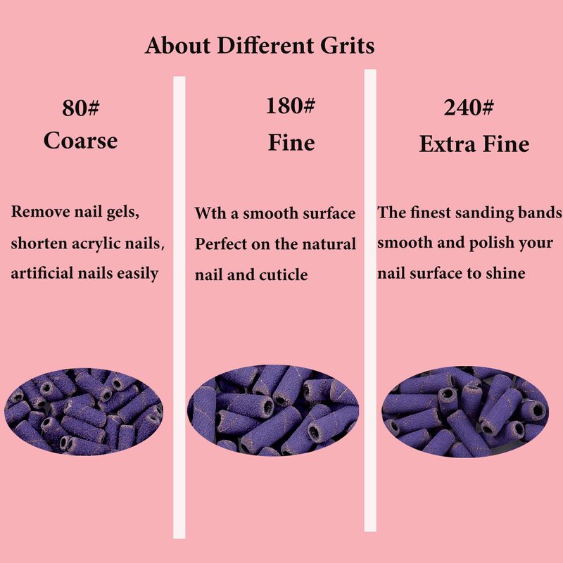 - Various Grits: 80#, it helps to remove nail gels, shorten acrylic nails or artificial nails easily.180#, it comes with a smooth surface. It is perfect on the natural nail and cuticle with your nail file's low speed. 240# helps you smooth and polish your nail surface to shine.
