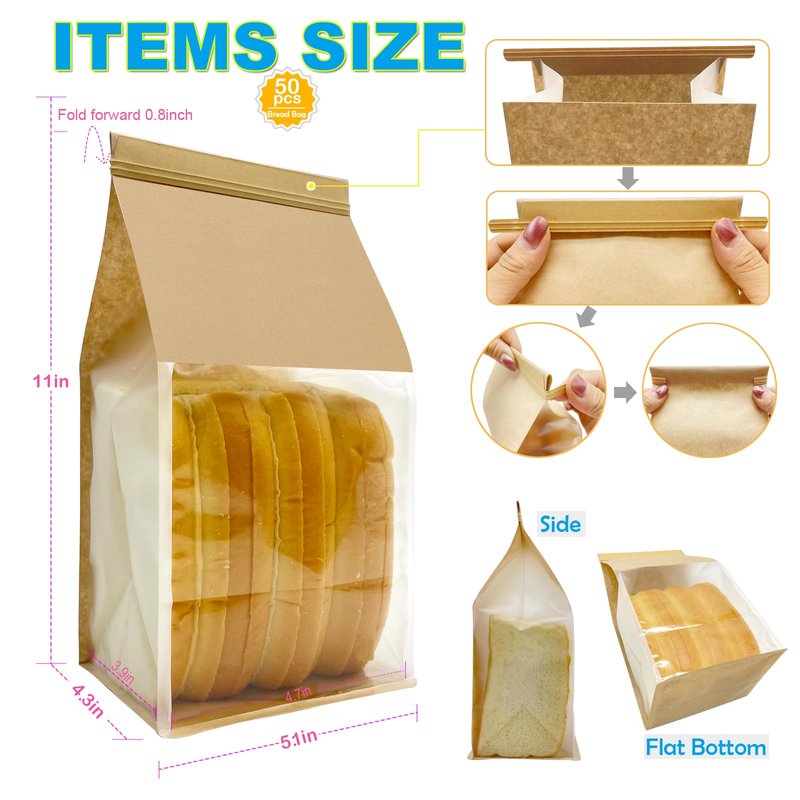 - VALUE PACK:Included a dozen 50pcs 5.1x4.3x11 inches brown kraft paper bread bags,This bakery bags with window and tin tie tab lock resealable,excellent clear window,flat bottom. Use for sourdough bread bags,cookie bags,snack bags,pastry bags,candy bags,treat bags,popcorn bags,coffee bean bags,celebrate food storage.