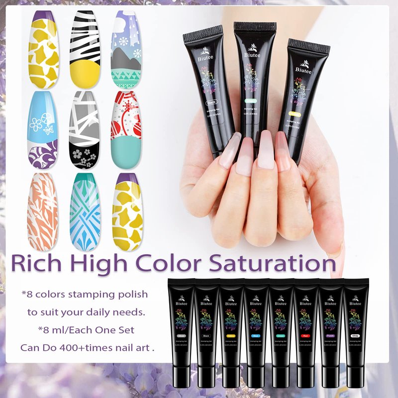 - Stamping Nail Gel Polish: 8 Colors black, white, blue, gold, green, purple, red, silver. Nail art stamping gel is super pigmented and saturated with nice consistency. 'NOTE' Need UV Lamp Curing!