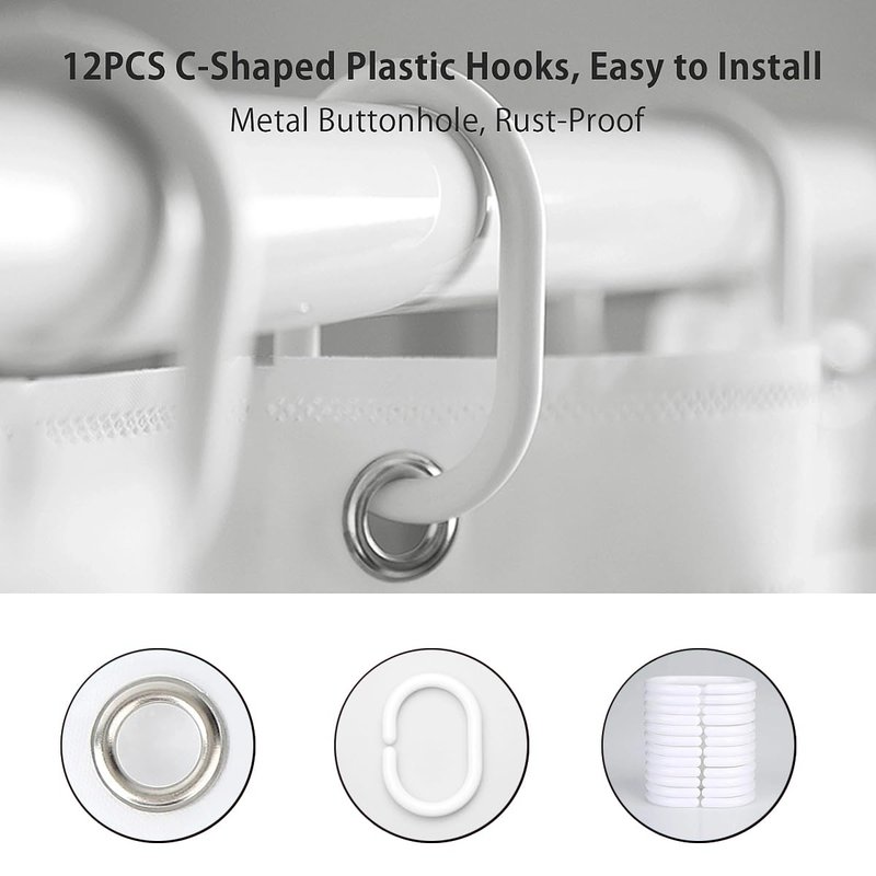 - PACKAGE INCLUDES:1 X Shower Curtain,12 X Plastic Hooks,No Extra Liner Needed,Machine Washable.