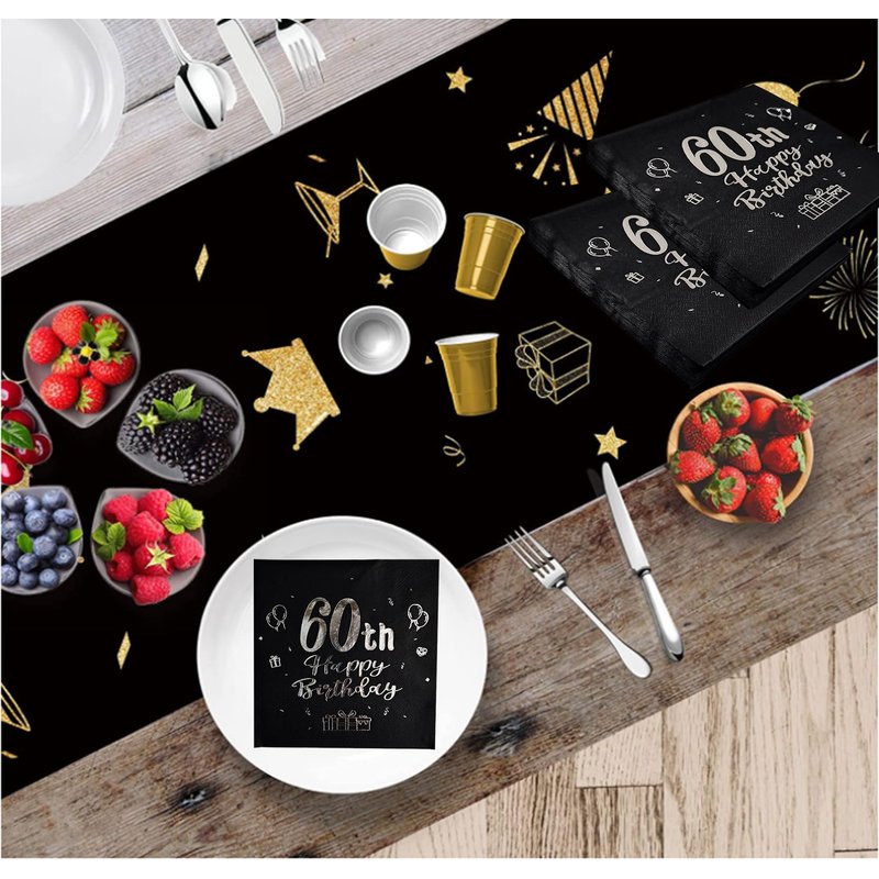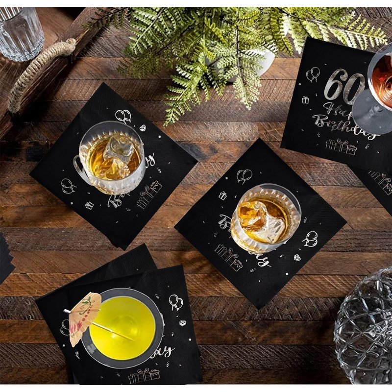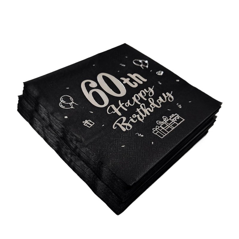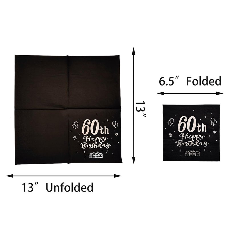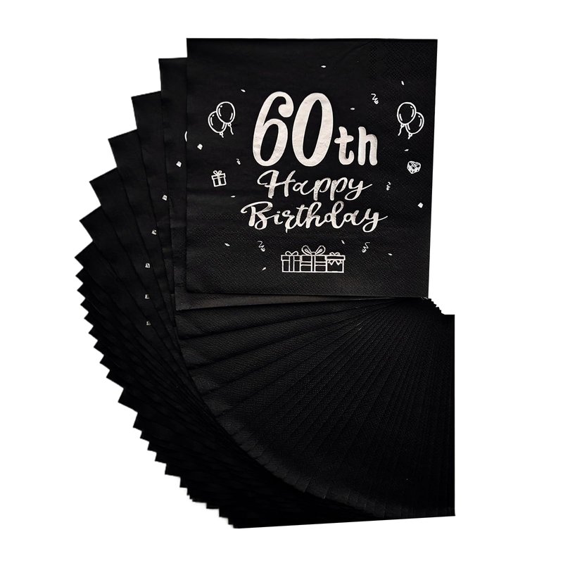 - 1. Include: 32 Counts Silver Letter Printing on Black background Napkins-Happy 60th Birthday.Real foil imprint design that shines in the light. Food safe. Ideal for Home Party Decorations.