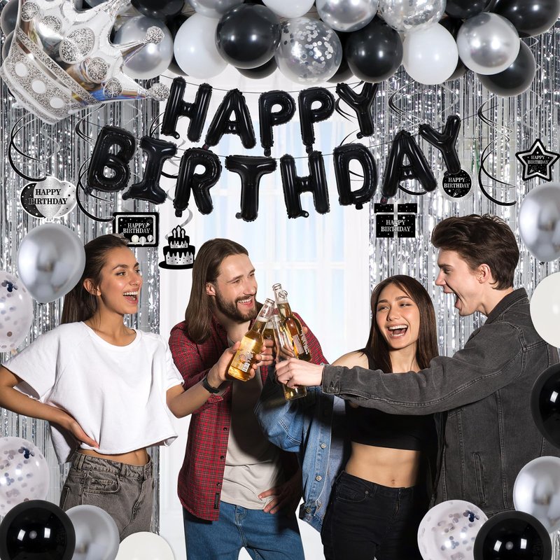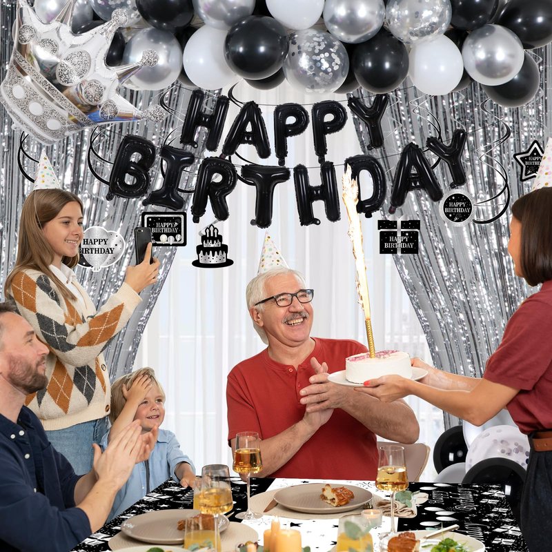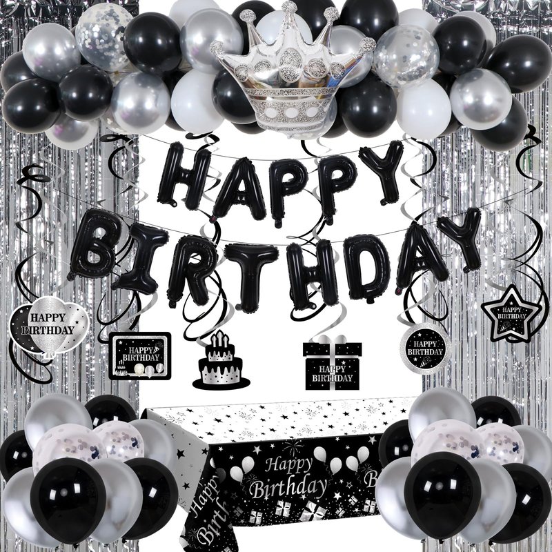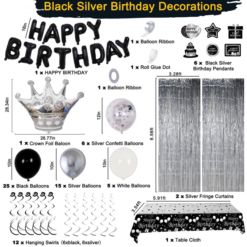 - 【Birthday Decorations for Men Women】 : Black and silver birthday party supplies includes 25× 10'' Black Balloons ,15× 10'' Sliver Balloons,5× 10'' white Balloons, 6× 12'' Silver Cofetti Balloons, 1× Silver Crown Balloon,16" HAPPY BIRTHDAY Balloons, 2× Silver fringe curtain, 1x tablecloth.