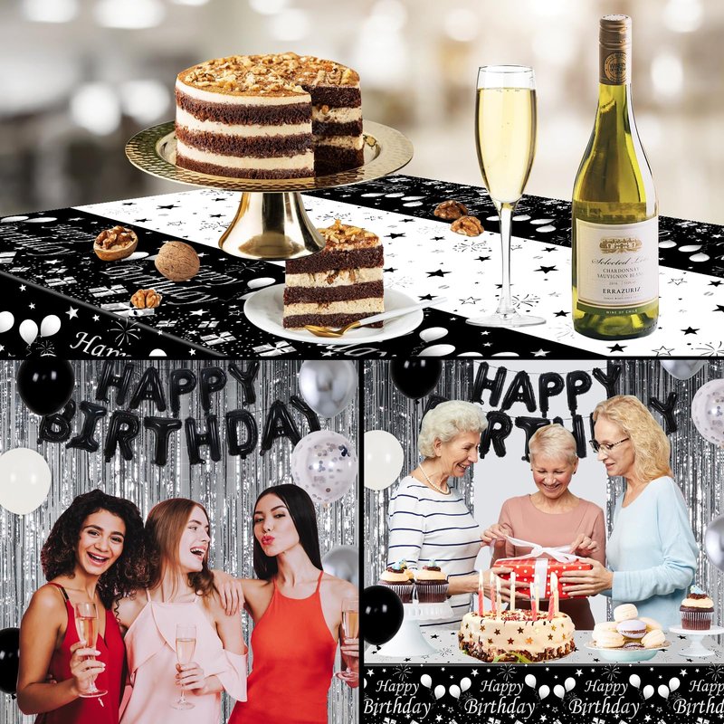 Black and Silver Birthday Decorations for Men Women, Happy Birthday Decorations for Boys Girls, Black and White Birthday Party Decorations Foil Balloons Fringe Curtains Tablecloth Hanging Pendant