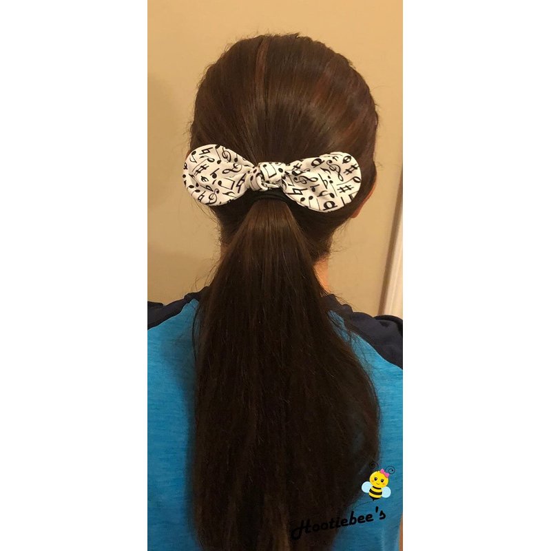 This bow is made from fabric and is on an elastic ponytail holder. The bow is approximately 5.5" wide by 2" tall. All items come from a smoke-free home. Note: Model in picture is 21 year old adult.