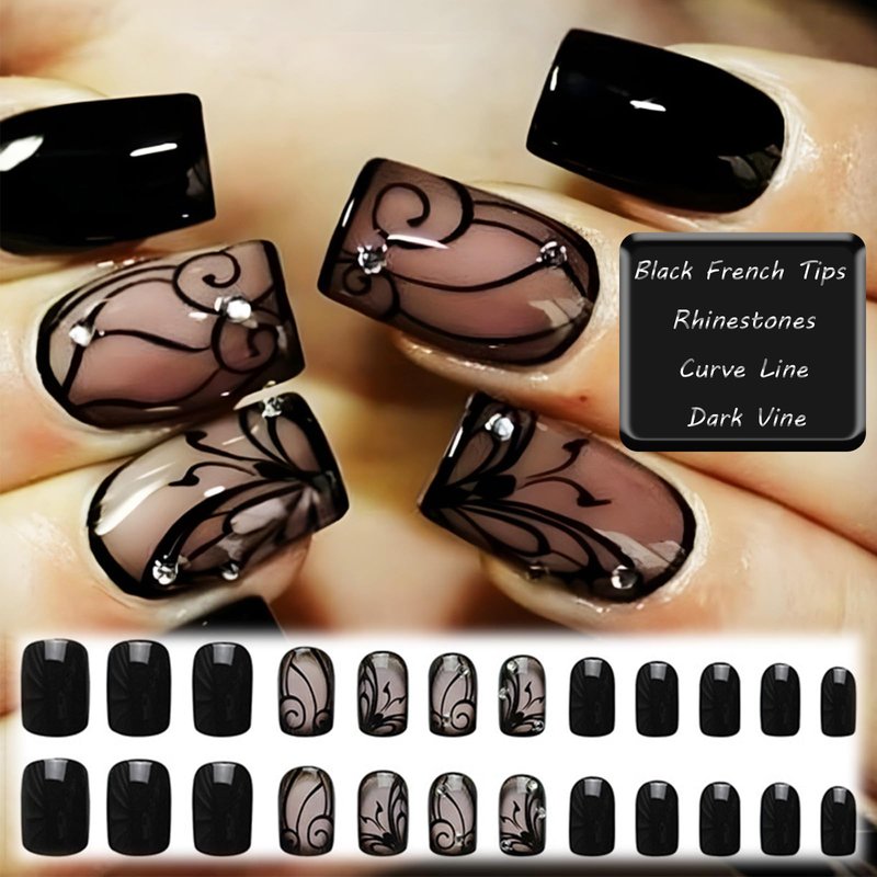 Black Curve Line Press on Nails with Dark Vine Design, Glossy Black Ins Medium Square False Nails Gel Glue on Nails, Rhinestones Manicure Art Acrylic Fake Nails Stick on Nails for Women Girls 24Pcs