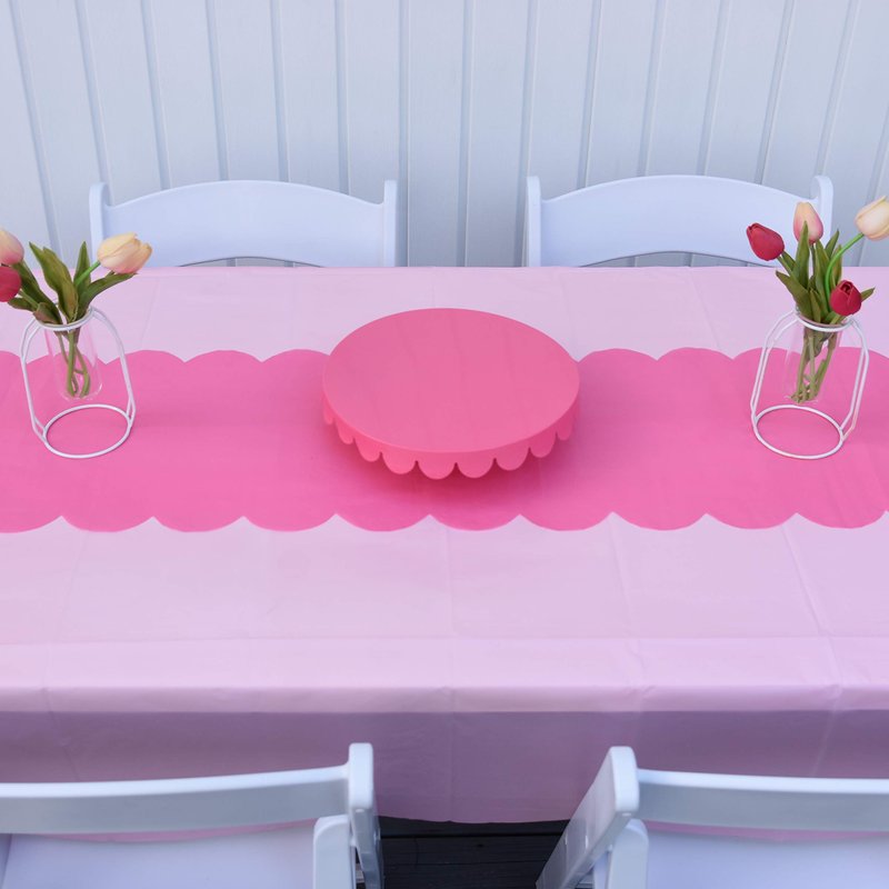 Scallop Table Runners. Transform your table from blah to beautiful in an instant! Coordinate with our Premium Tablecloth Collection for a beautiful table setting! Easily cut the runner to desired length for smaller tables. If you have a long party table, attach the edges of several runners with a piece of tape and spread across long tables.