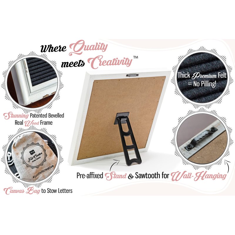 - ENDLESS CREATIONS - Self-expression has never been easier! Your decorative and announcement board comes with 350 ¾” White Alphabet Letters, Numbers, Punctuation, and Emojis! Our characters are high quality and stay put. Includes a burlap sack, pre-installed sawtooth hanger for wall hanging and stand for upright positioning ! A cute wifi password sign for home or business or bulletin board for your guest room table. Customize them for your cubicle desk with your own creative ideas!