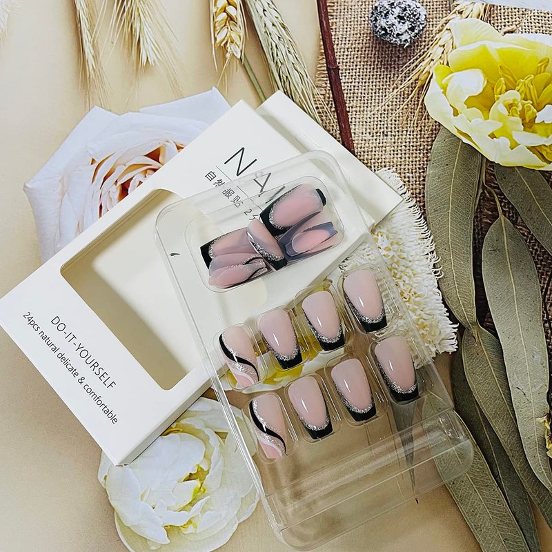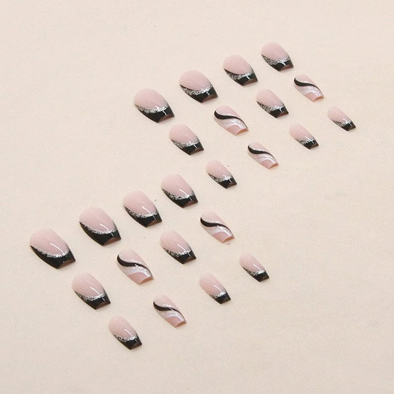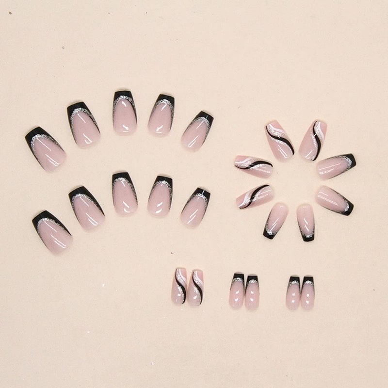 Black French Tip Press on Nails Medium Length Square Fake Nails with Silver Glitter Line Designs Glossy Coffin Nails Full Cover Nail Tips Glue on Nails Artificial Acrylic False Nails for Women 24Pcs