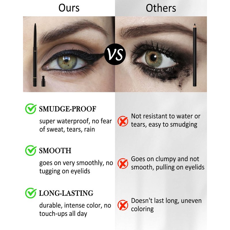 - Waterproof & Smudge-Proof - Say goodbye to smudged and running makeup! Our high pigmented eyeliner pencil is waterproof, sweat-proof and smudge-proof, intense coloring lasts 24 hours wearing. Ensure your makeup stays put and fresh throughout the day, making you be center in the crowd.