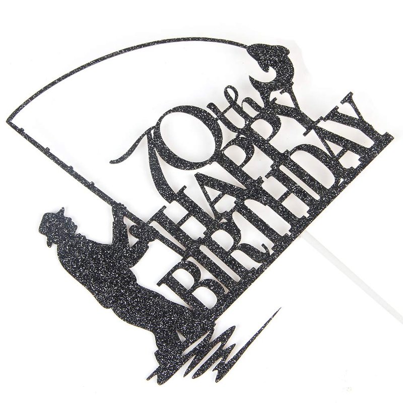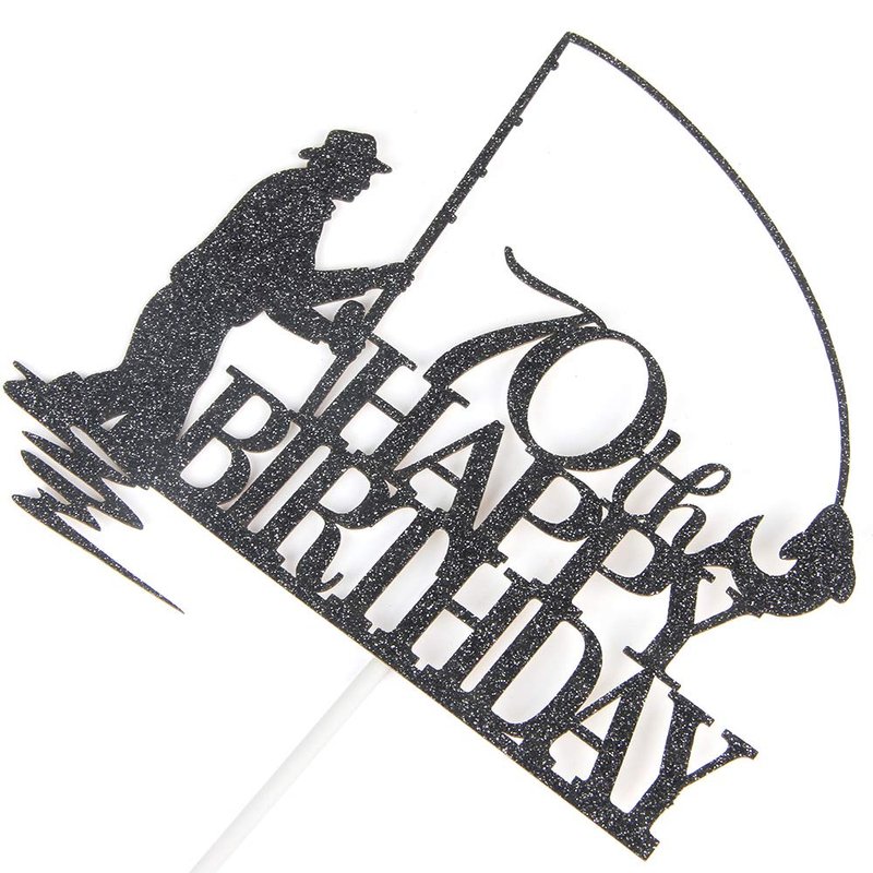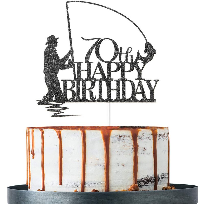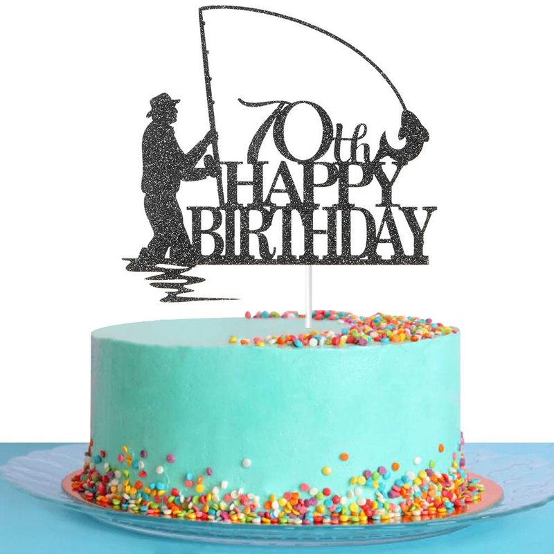 Black Glitter Fisherman Happy 70th Birthday Cake Topper, 70th Birthday Decorations, Fisherman 70th Birthday Party Supplies