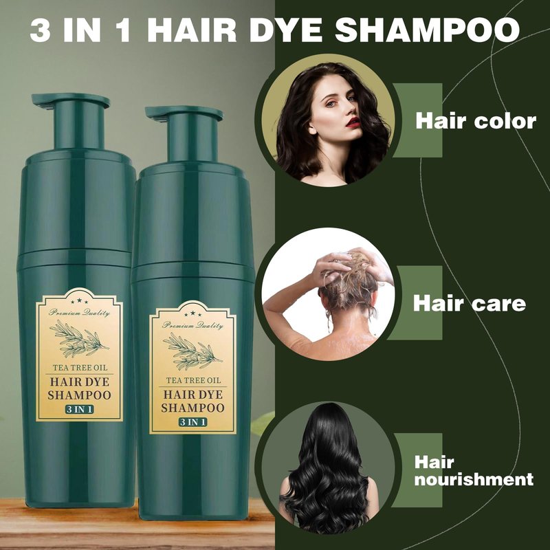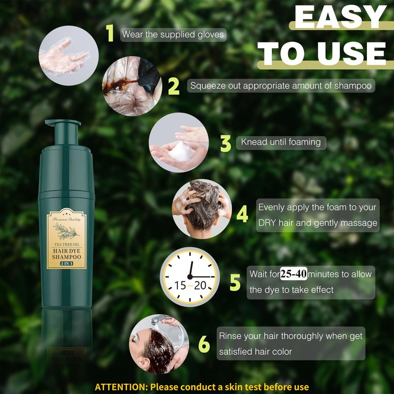 - 3 IN 1 BLACK HAIR DYE SHAMPOO: Different from traditional damaging hair dye, our tea tree oil hair dye shampoo covers gray easily while cleans and cares for hair. Gentle formula provides you with a more natural color, maintains the hair's moisture balance and reduces dryness. Bring out the vibrancy of your color while conditioning your hair for smoothness and softness.