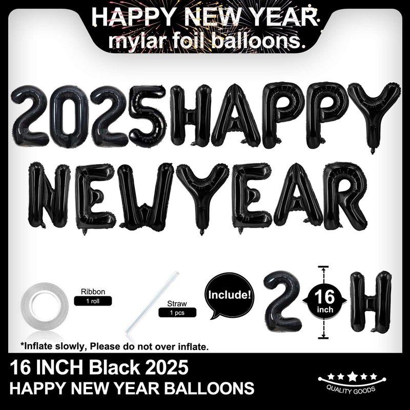 - Package Included: Big 16 INCH Black Foil HAPPY NEW YEAR 2025 Foil Numbers Balloons,1 Inflatable Straw,1 Ribbon.Black Happy New Year 2025 Balloons, 16 Inch New Years Eve Party Supplies 2025 Balloons , New Years Decorations 2025,NYE Balloons, New Years 2025 Balloons