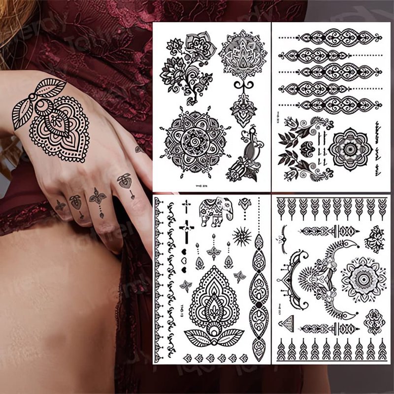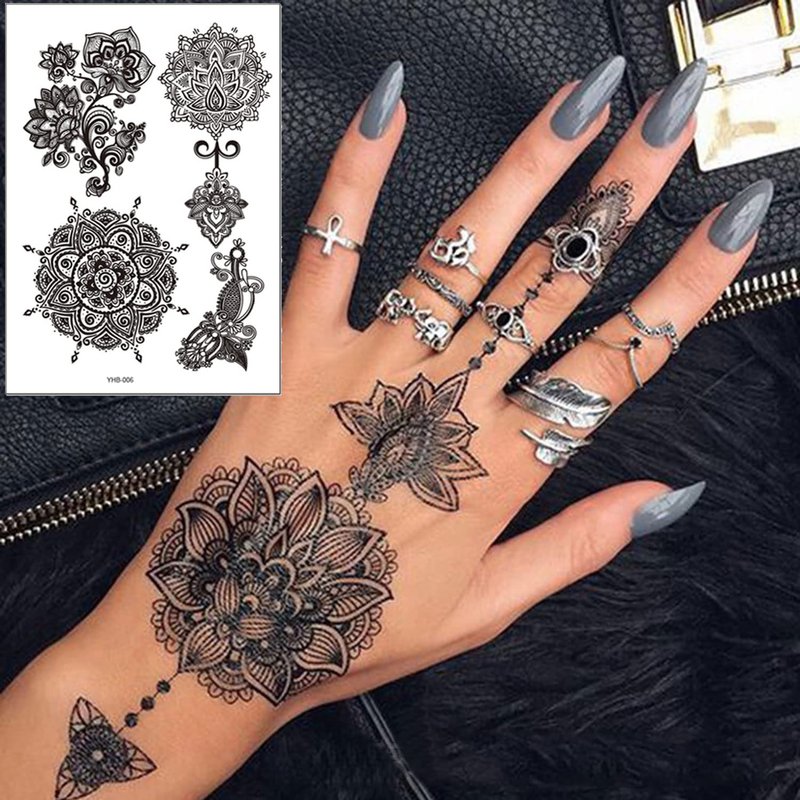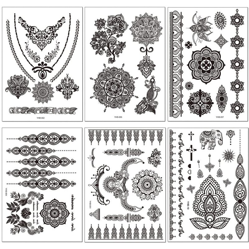 - Mystery & Sexy Design: 6 sheets semi-permanent henna lace tattoo stickers with black mandala flower elephant chain design that will bloom your glamour and sensuality, perfect for decorating your body at wedding or Coachella festival.