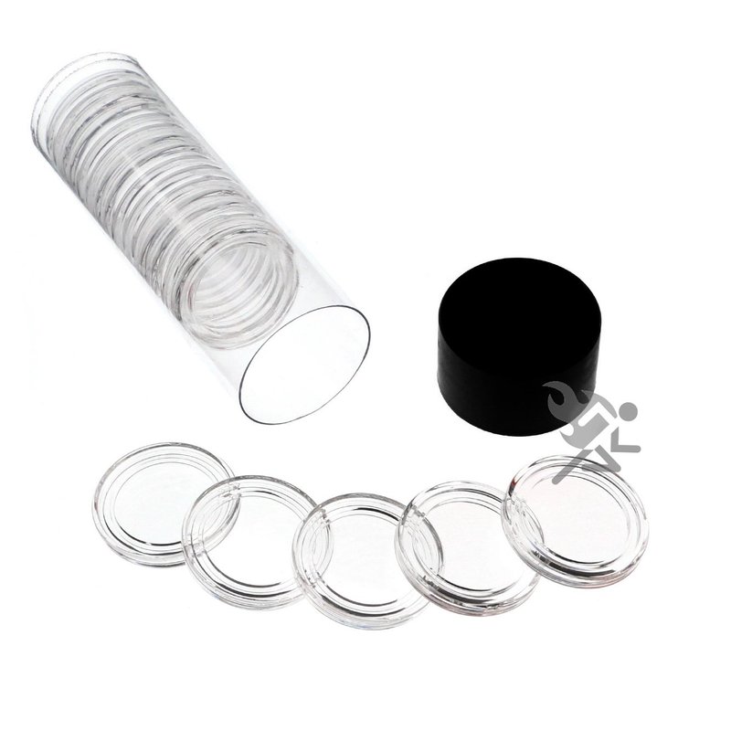 Each capsule tube is designed for storing coins encapsulated in Air-Tite brand coin capsules. Each capsule tube holds up to 20 completely closed coin capsules. Tubes are crystal clear and PVC free with a snug fitting cap. A welded bottom allows for a complete view of any enclosed capsules. The A22 model Air-Tite coin capsule holder is made from acrylic plastic with a non-yellowing agent, a process that results in a final product that is hard, crystal clear, and smooth to the touch. The cover and base snap together firmly to form a perfect seal. Capsules are PVC free, archival safe, and suitable for extended periods of long term coin or bar storage. Coin capsules are securely packaged un-assembled within layers of foam to protect them during shipment. Capsule tubes and coin capsules are made in the USA.