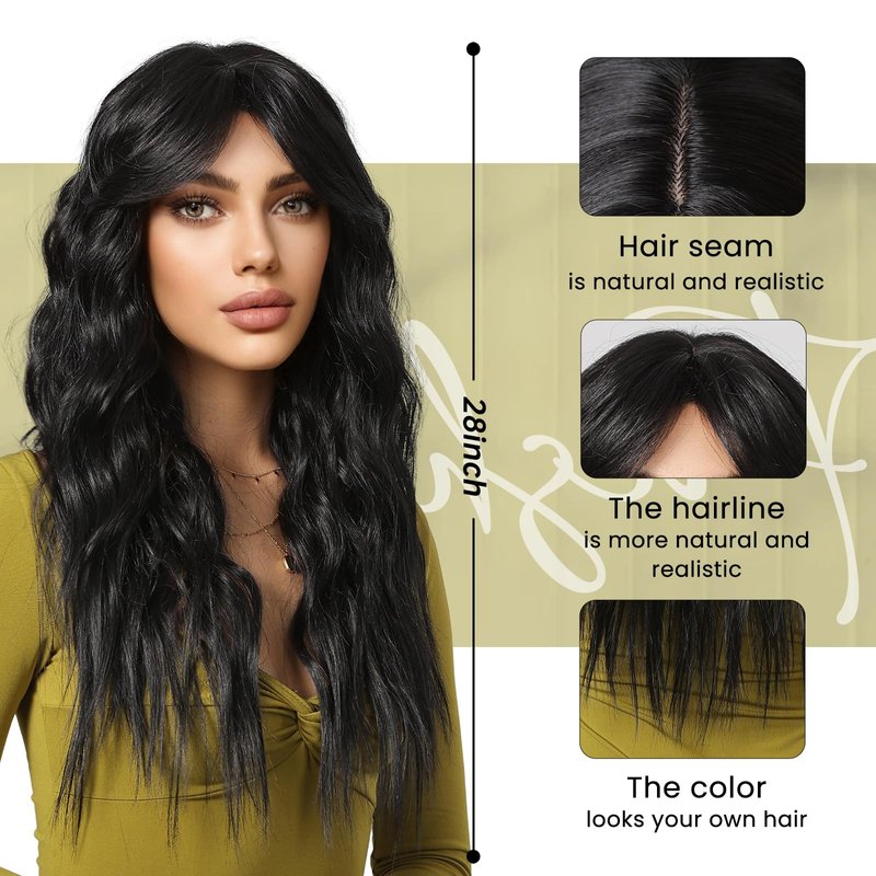 Black Long Curly Wigs for Women Synthetic Curly Natural Black Wig with Curtain Bangs Hair Replacement Wig for Girls Daily Party Use 28 Inches