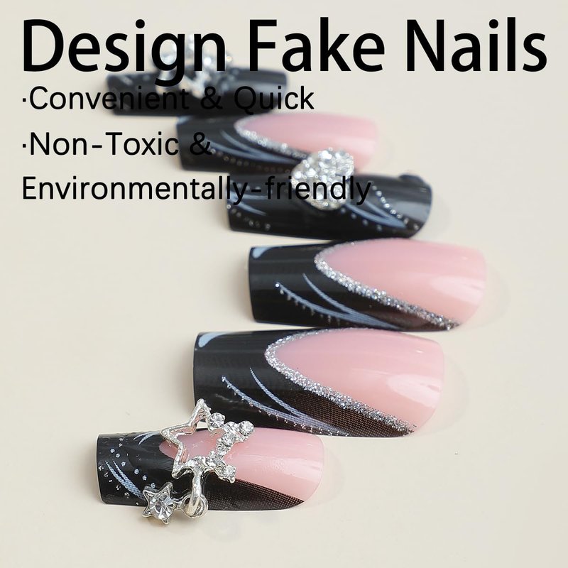 - Unique Design: The long square acrylic glue on nails are designed by top manicurist, black press on nails with silver glitter line design,which looks elegance.long fake nails black are an excellent option to boost your mood.Perfect for urgent appointment or any special occasion.
