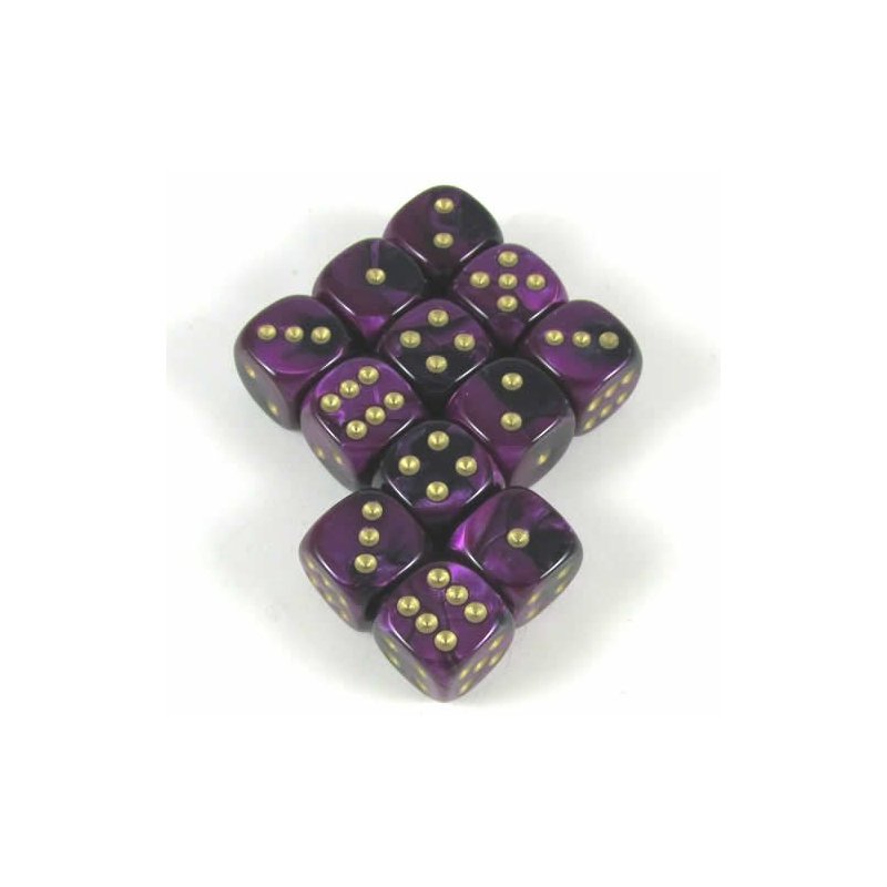 WCX26840E12 Black Purple Gemini with Gold Pips 12mm D6 Dice (12)