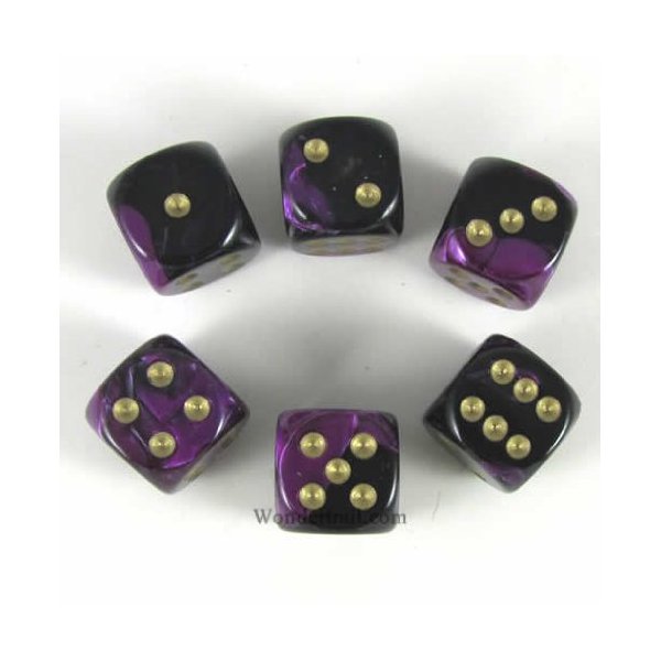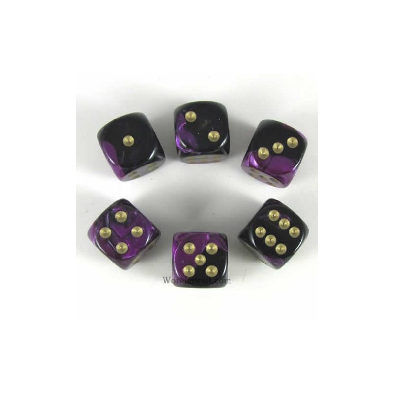 Black Purple Gemini with Gold Pips 16mm D6 Dice Set of 6 Wondertrail WCX26640E6