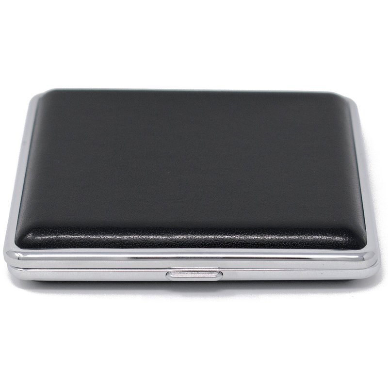 Covered in genuine smooth leather, this metallic cigarette case is sturdy, corrosion resistant and will last you for years to come. Measuring 4" X 3.25", this case can accommodate a full pack: 20 Kings or Regular size cigarettes. Available in Black and Brown colors and in smooth and crocodile leather prints. Crush-proof, this cigarette case features double clips to secure your cigarettes and other smoking accessories. Extra sturdy hinges and a release button on the front ensure that your contents will remain safe and never get crushed. With both sides covered in leather, this case can comfortably slip into your pocket or bag. Great for credit cards, driver’s license, ID cards, cash and all types of smoking accessories. Looking for something else? We offer our cases in several sizes: From a regular sized cigarette case that accommodates a full pack to slightly smaller 16-count pack, a compact half-pack size and an ultra-compact size. We have cigarette cases for Regular Size, King Size, 100s and 120s and in both metallic and leather finishes. Don’t want to deal with clips? We also sell cigarette cases with elastic bands. Please see our other cigarette case listings for more options.