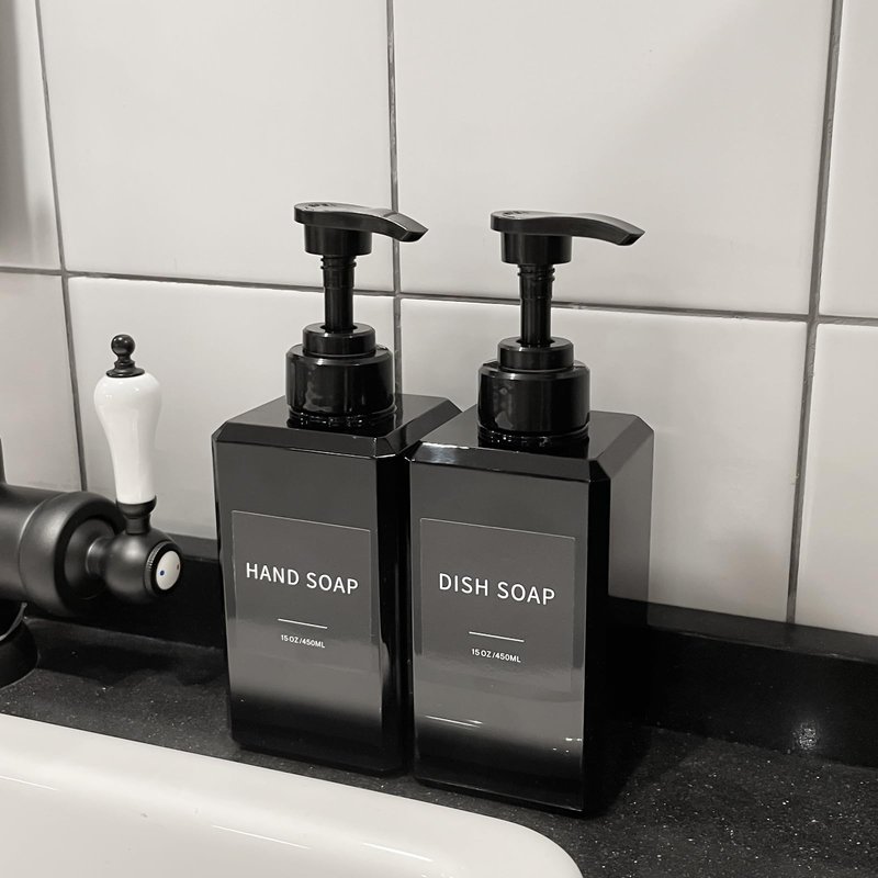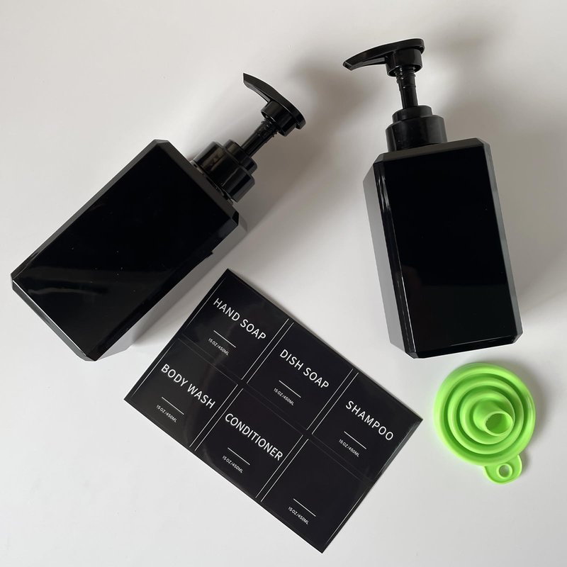 Black Soap Dispenser with Waterproof Labels, 15 oz Dish Soap Dispenser for Kitchen, Thickened Plastic Hand Soap Dispenser for Bathroom, Shampoo and Conditioner Pump Bottles with Silicon Funnel, 2 Pack