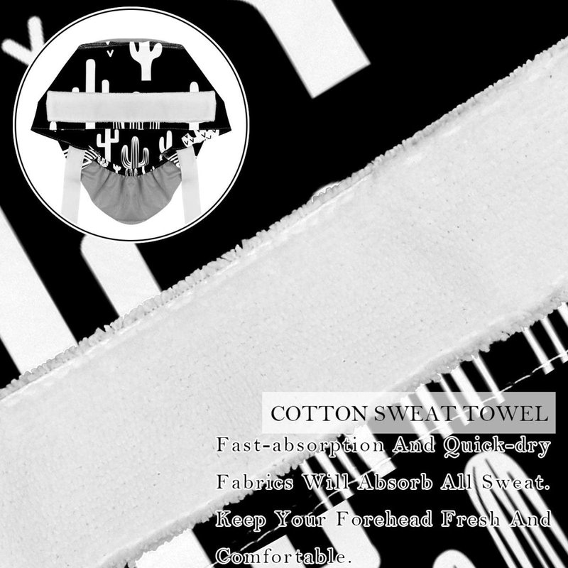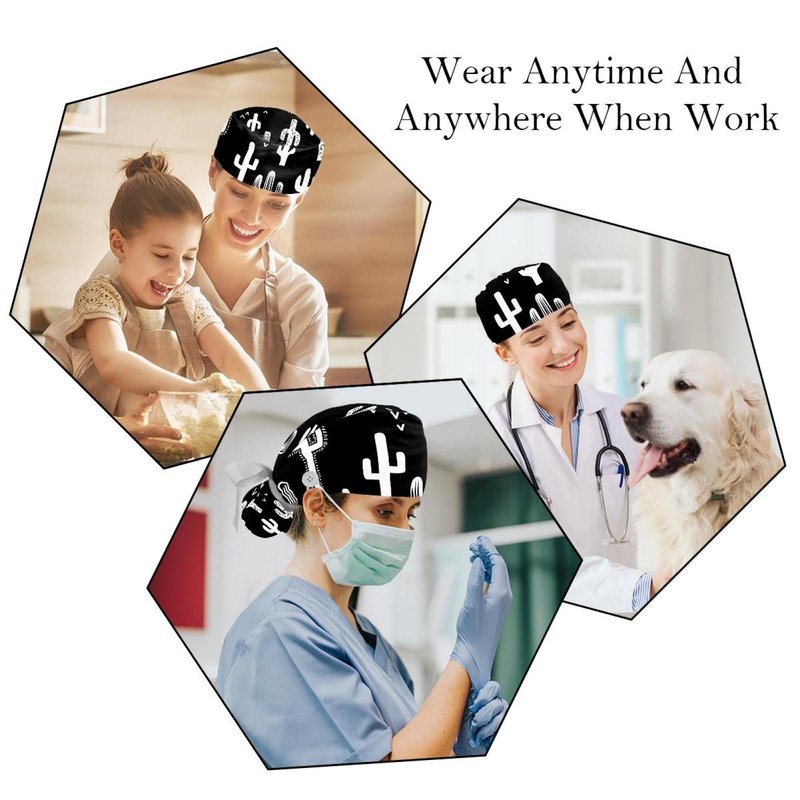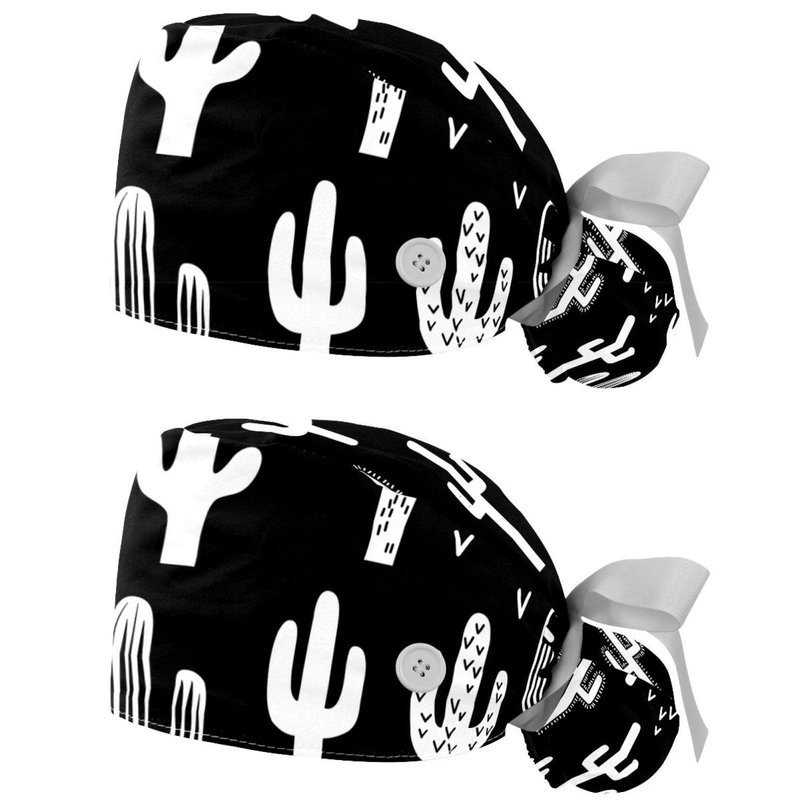 Black & White Fun Western Cactus Scrub Caps Hats Women Bouffant Working Hat Ponytail Holder for Women Long Hair Covers 2PCS