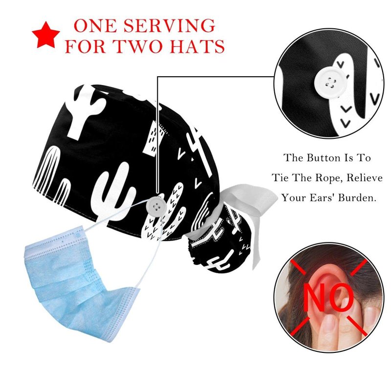 - Our ponytail scrub caps have 2 buttons on each side that are designed specifically for your ear. The two buttons are in the right place, not too tight or too loose. Don't worry that the string will cut or rub your ears, suitable for long-term wear.