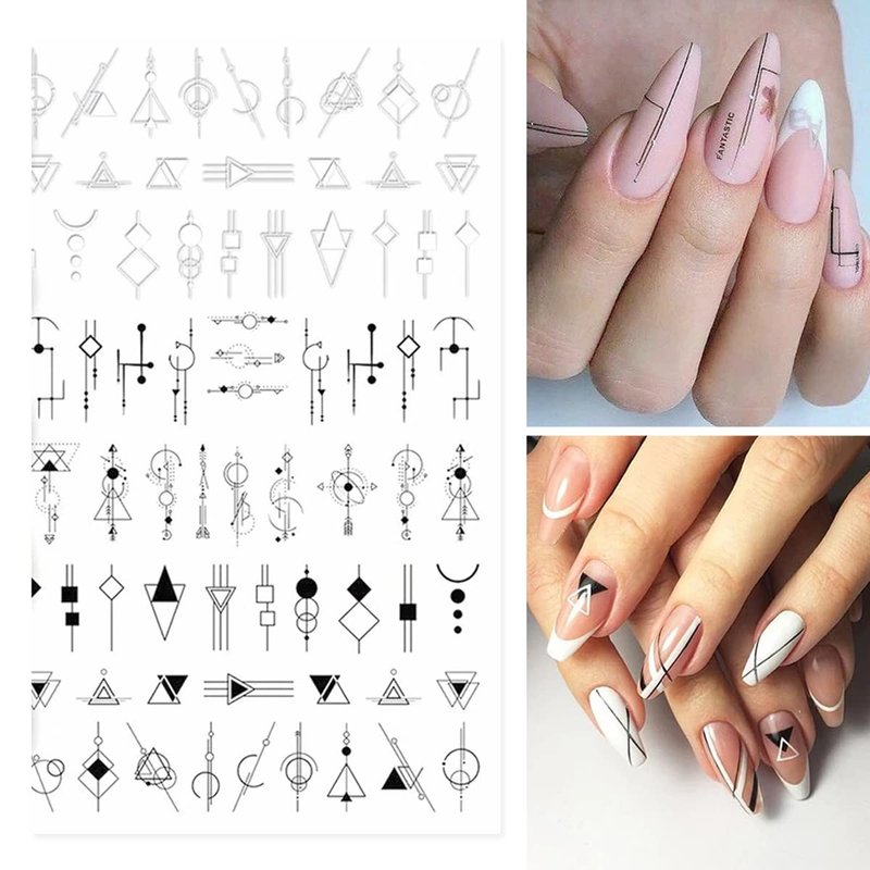 - Black White Style Nail Decals: These 3d nail stickers are design with geometry, cool English letter, love heart etc french style pattern. Help to create a charming, elegant and romantic French nail styles.