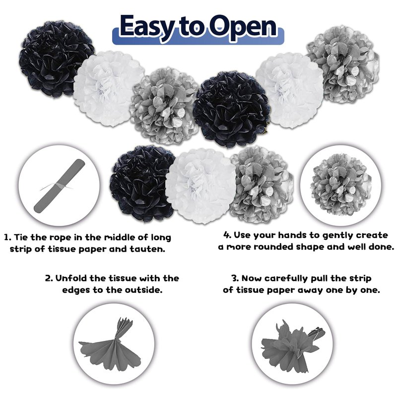 - Create a Birthday Atmosphere: Elegant tissue pom poms, fringe party curtains, and sparkling star garlands combine to create an eye-catching backdrop. Whether you're planning happy birthday decorations black or hosting a classy event with black and silver party decorations, the playful design and vibrant colors will transform your space. Guests will love the lively atmosphere, ensuring your party feels unforgettable.