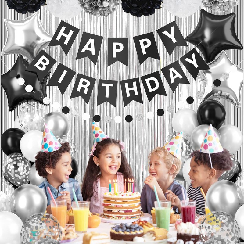 - Birthday Decorations Set: This quality black and white birthday decorations set includes everything you need: 1×Happy Birthday banner, 1×star garland, 2×purple fringe party curtains, 12-inch-5×white birthday balloons, 5×metallic silver, 5×black, 5×silver confetti, 10-inch-6×tissue paper pom, 18-inch-4×foil star balloons, 2×ribbon, 1×dispensing. With these black white silver balloons, you’ll have all the essentials to make your party stand out!