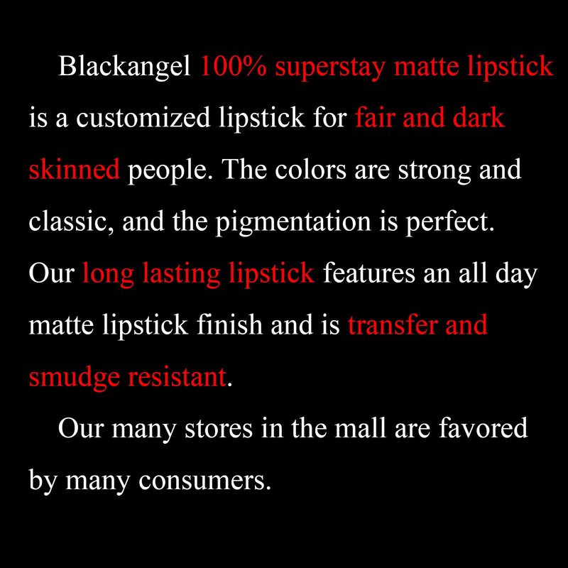 - 𝐁𝐞𝐧𝐞𝐟𝐢𝐭𝐬: Using Blackangel Super Stay Matte Liquid Lipstick will help you achieve a perfect look for any occasion. The long-lasting formula means you don't have to reapply throughout the day and the waterproof formula means you can wear it for any activity without worrying about it coming off. The matte finish gives you a beautiful and professional look.Benefits: Using Blackangel Super Stay Matte Liquid Lipstick will help you achieve a perfect look for any occasion.