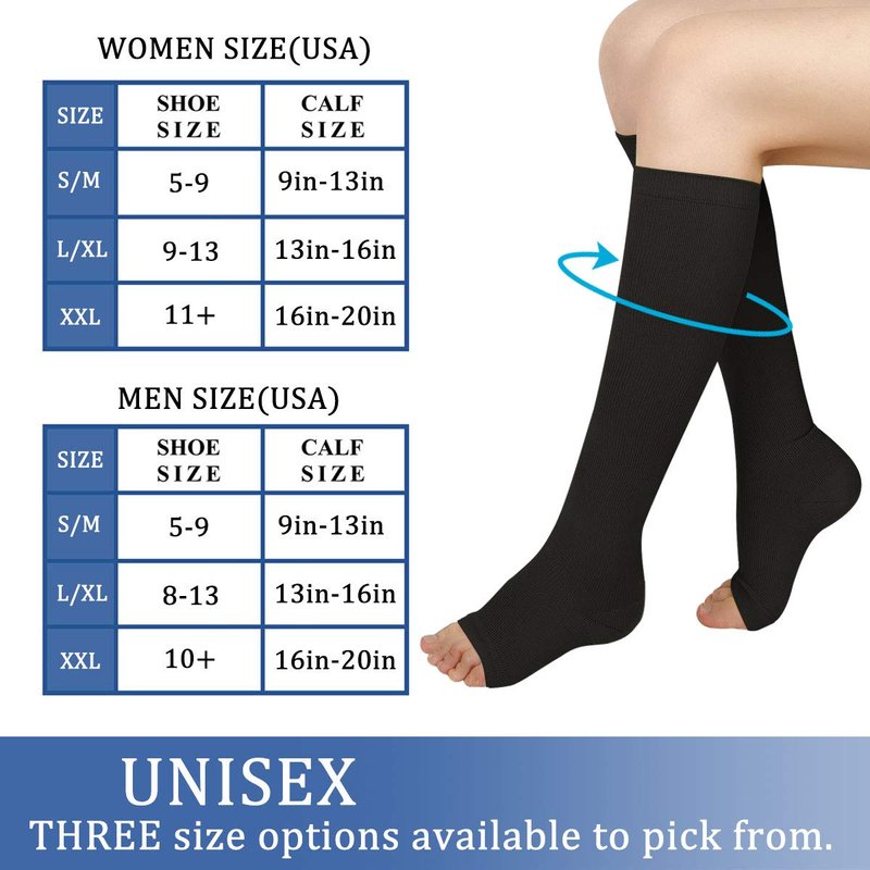 - MORE SIZE CHOICE: Open-toe knee-high compression socks for men and women, Suitable for all occasions,you can refer to the chart to choose the suitable size. Our compression socks have nice and snuggly supportive without being too tight or painfully uncomfortable, enhance blood circulation effectively.