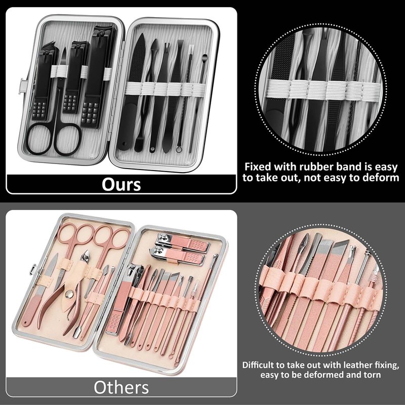 - 🌸🌸Multi-function Nail Grooming Kit: Nail cleaning kit contains 10 tools for your basic needs. Trimming Eyebrow shaping, pedicuring, anti-acne, exfoliation and ear cleaning. Fixed with rubber band is easy to take out, not easy to deform. A great value set provide a more comfortable and relaxing user experience.