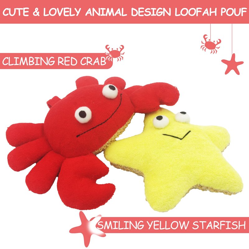 Bleu Bath (2 Pack) Animal Body Scrubber Natural Linen Shower Ball for Toddler Kids Gentle Exfoliating Bath Sponge Loofah Pouf in Yellow Starfish Red Crab with Cute Big Eyes Design