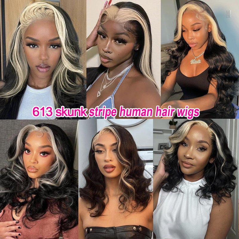 - Highlight 613 Skunk Stripe Wigs Are Very Popular:The skunk stripe is the next generation of chunky highlights, a popular hair trend and new trendy color style you must have,skunk stripe wigs simple enough for anyone to try out but unique enough for anyone to stand out in