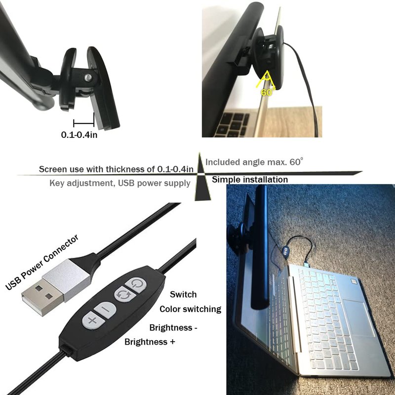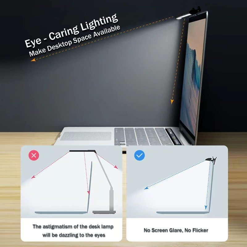 - 【Protect Your Eyes - Glare Free】The Eye-Caring Laptop Light Bar only illuminates the keyboard and desktop and ensures this USB powered monitor lamp eliminates the flicker and glare of typical desk lamps on the computer monitor. Protect your eyes while you work and study. The clip supports laptop screens less than 0.4in thick, The wire is 3.15 in long. Only take one second, you can firmly install Monitor Light Bar on the top of the computer, lighting、saving valuable desk space!No noise!