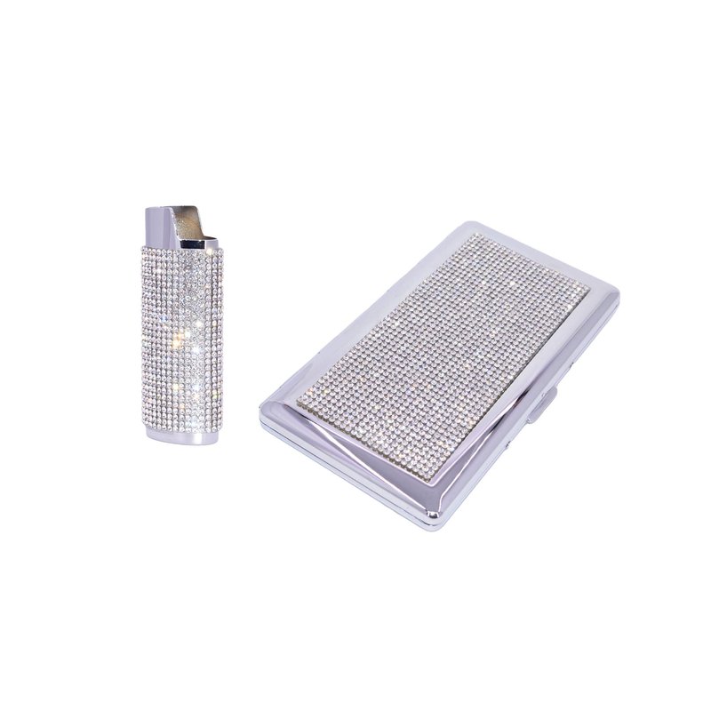 BLING SPARKLING LIGHTER CASE. COLOR: Smooth, mirrorlike, and shiny silver color with crystal rhinestones dresses up your lighter case. HANDMADE: In Houston, Texas using custom adhesive and fine quality rhinestones. UNIQUE LUXURY GIFT: Great gift to friend, family member or business associate. Or Yourself! MATERIAL: Alloy metal with enough density to keep the lighter in durable shape. ITEM SIZE: Lighter case size is 3.13” x 1.25” x 1.13”. WHAT LIGHTER SUITS: This lighter case is only for BIC Standard size lighter (not sold, created, or affiliated by/with BIC). LIGHTER NOT INCLUDED. "BIC" trademark owned by the BIC corporation. BLING SPARKLING CIGARETTE CASE COLOR: Smooth, mirrorlike, and shiny silver color with crystal rhinestones dresses up your cigarette case. HANDMADE: In Houston, Texas using custom adhesive and fine quality rhinestones. UNIQUE LUXURY GIFT: Great gift to friend, family member or business associate. Or Yourself! CRUSH PROOF: This cigarette case features a clip to secure your cigarettes and other smoking accessories. Extra sturdy hinges and a release button on the front ensure that your contents will remain safe and never get crushed. ITEM SIZE: Measuring 3” x 5” x 1/4”, this case can accommodate 120s & 100s. Holds 6-9 cigarettes. VERSATILE: Case can comfortably slip into your pocket or bag. Can also be used to carry driver’s license, tissues, money, ID, credit cards, business cards, metro card, driver's license, nail scissors, nail file, condoms, etc! NO TOBACCO PRODUCTS ARE INCLUDED.