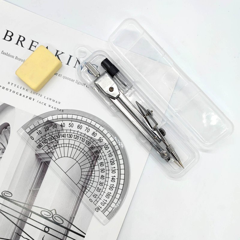 1pcs silver metal compass, 2pcs lead refills (diameter: 2mm), 1pcs eraser ,1pcs protractor and 1pcs transparent case.