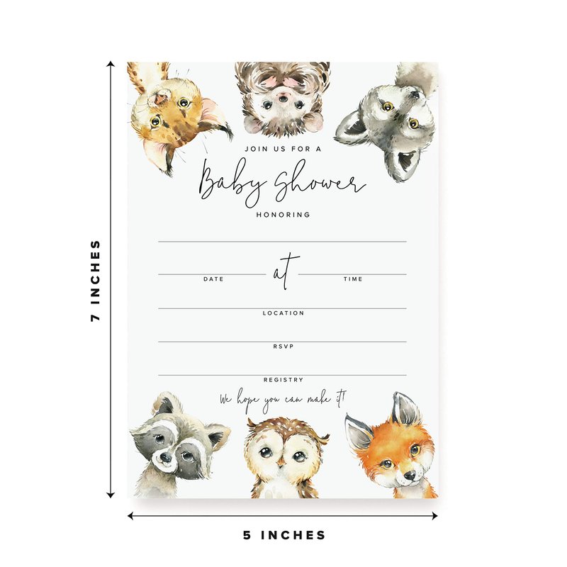 Bliss Collections 25 Baby Shower Invitations with Envelopes Woodland Animals, Forest Creatures, Fox, Owl, Racoon, Wolf, Hedgehog, Bobcat - Gender Neutral, 5x7 Cards