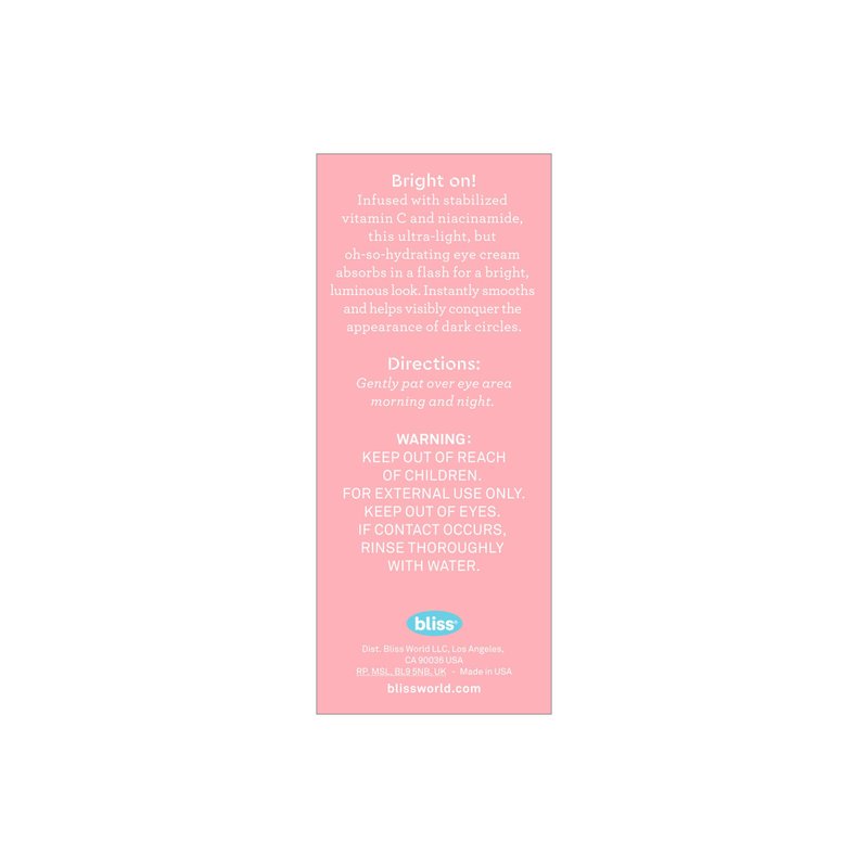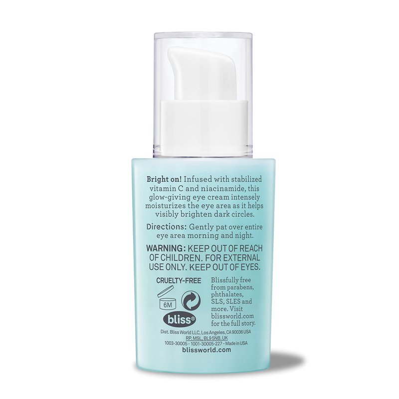 Product details Infused with stabilized vitamin C and niacinamide, this ultra-light, but oh-so-hydrating eye cream absorbs in a flash for a bright, luminous look. Instantly smooths and helps visibly conquer the appearance of dark circles. Subtle iridescent sheen provides a healthy glow while brightening and reviving the eye area Nourishes to combat dryness and flaking Bliss Ex-glow-sion Radiance Boosting Eye Cream Vitamin C 0.5 fl oz