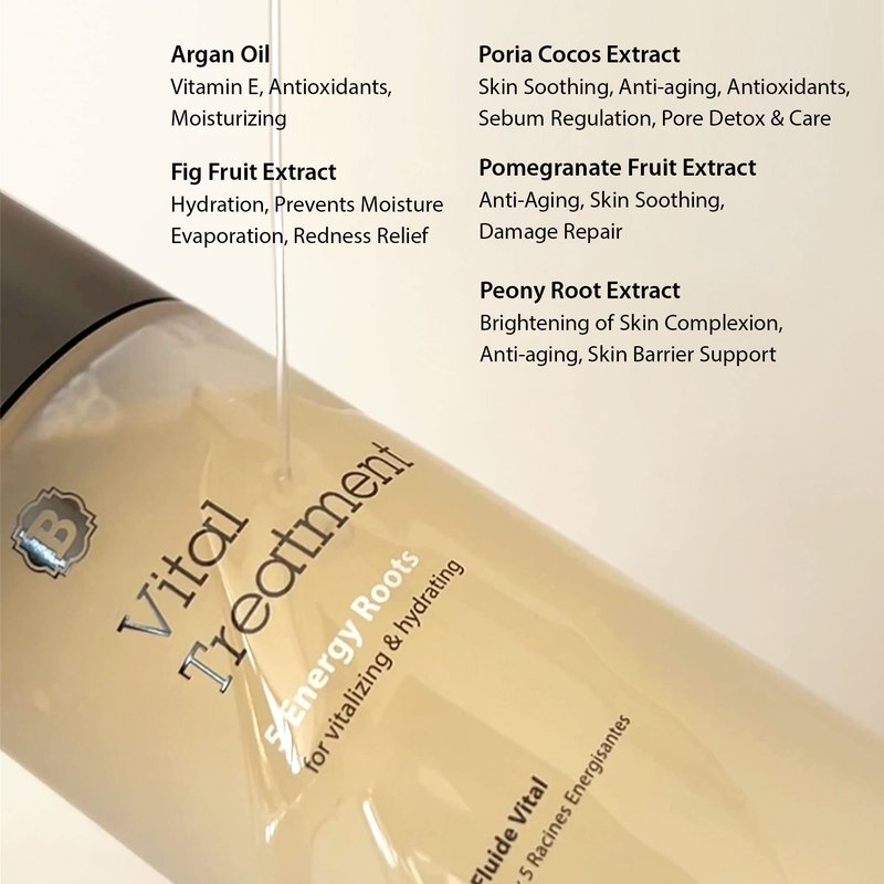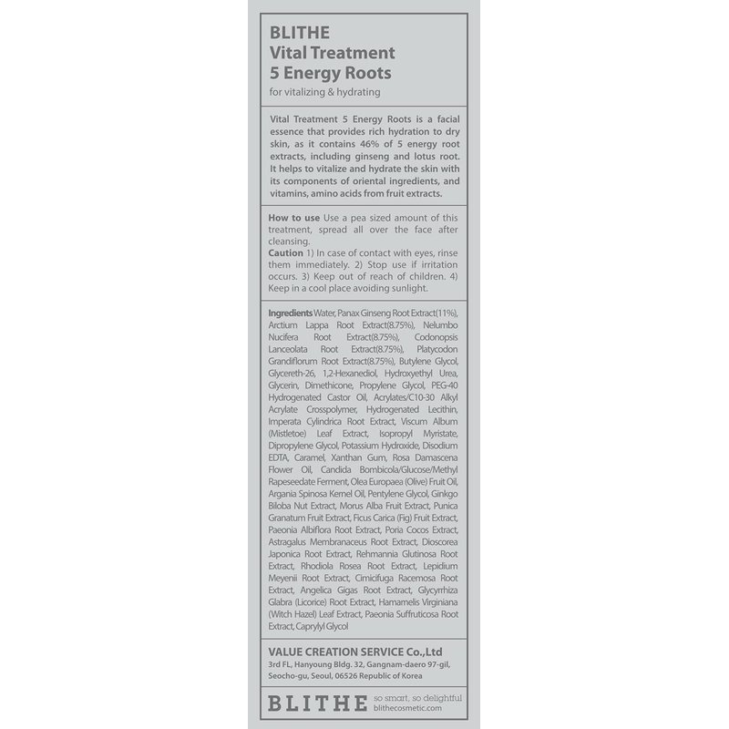 Blithe Vital Treatment 5 Energy Roots skin lotion is a hydrating clear essence for face packed with hydrating properties that energize dull and depleted skin. Blithe Vital Treatment 5 Energy Roots is a rice water essence for face that can be used in your daily Korean skin care routine as both a night and day essence/toner. Apply the face essence water after cleansing your face and before using any other heavier face creams or lotions. The 5 Energy Roots astringent lotion is a nature-inspired skincare product that contains no artificial fragrances and was developed for people with sensitive and mature skin. The 5 Energy Roots combination face moisturizer is full of natural root extracts that have multiple skin-caring benefits: The 5 Energy Roots Essence has a rich and soft liquid texture consisting of extracts from 5 types of roots that are rich in vitamins and amino acids. Each type of root extract provides various benefits for the skin such as nutrition and antioxidants that may help improve the natural strength and energy of the skin. The 5 roots are known for having the following benefits; 1. Burdock Root: Minerals and healthy complexion 2. Lance Asiabell Root: Antioxidants and anti-inflammatory 3. Balloon Flower Root: Rich in amino acids and soothes skin 4. Red Ginseng: Antioxidants and energy 5. Lotus Root: Vitamin C and antioxidants. Formaldehyde-free, Gluten-free, Mineral Oil-free, Paraben-free, Phtalate-free, and Synthetic fragrance-free. Not tested on animals. Hypoallergenic patch tested. Safe for pregnant women.