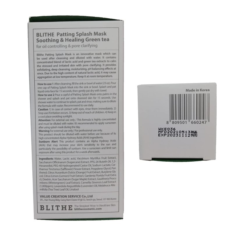 Begin your skincare routine in the bathroom with this exfoliating facial wash - the patting splash mask! The Patting Splash Mask was inspired by Korea’s traditional facial cleansing method of using rice water for exfoliation of the skin. It purifies irritated skin and provides moisture and nourishment starting from this facial cleansing step. The face exfoliant is easy to use by simply pouring one capful of the concentrate in a bowl of water and then patting the face with the water for 15 seconds. Feel your skin being cleansed and softened as the liquid mask gently removes dead skin cells and provides vitamins and nourishment to your skin. The facial liquid splash mask is an AHA Exfoliator as it contains 20% of Complex Fruit Extract Multi Fruit Conc (ACB Fruit Mix). ACB Fruit Mix is based on the standardized extraction of 5 plants that provides 5 natural AHAs: lactic acid (bilberry), glycolic acid (sugar cane), citric acid (orange and lemon), malic acid, and tartaric acid (sugar maple). These AHAs are used to make the skin smooth and shiny with exfoliating effect and to improve skin conditions such as rough skin, superficial wrinkles, and fine lines. Enjoy the benefits of Blithe Patting Splash Mask: Hypoallergenic exfoliation + Vitamin and nourishment supply + Balanced acidic pH + Moisturized and non-irritated feeling of the skin after wash. HOW TO USE: Method 1) After cleansing, fill the sink or bowl of water (23oz). Pour one cap of Patting Splash Mask into the sink or bowl. Splash and pat liquid onto the face for 15 seconds, then gently pat and towel dry. Method 2) Pour a capful of Patting Splash Mask onto palms in the shower and splash and pat onto cleansed skin for 15 seconds. Use shower water to continue to splash, pat and rinse, making sure to dilute the product with clean water. *Due to the high content of natural lactic acid, it may cause aggregation at low temperatures. Keep it at room temperature.